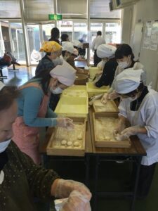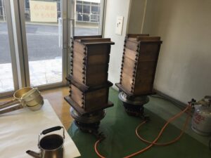 大きな釜で餅米を蒸していきます。今年は昨年の2倍!?60Kgの餅米を用意しましたっ(o≧▽゚)o