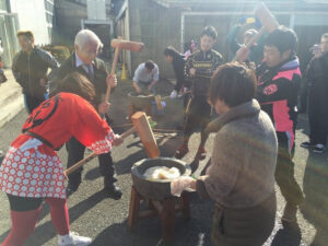 こちらは濱田市長、小磯選手、つき子さんによる餅つきコラボ。