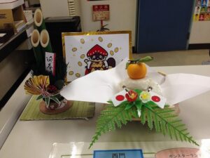 元日に行った餅つき大会も、お客様、選手会やもちドルなどみなさんのご協力により大いに盛り上がりました。その時についたお餅で、プチかがみ餅も作ってインフォメーションコーナーに飾ってあります(≧∇≦)
