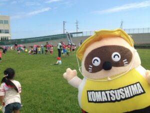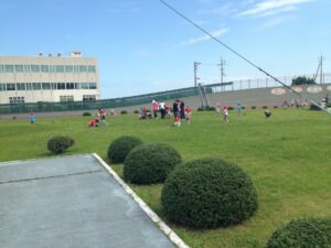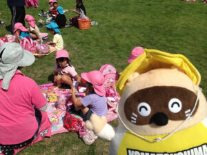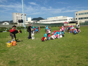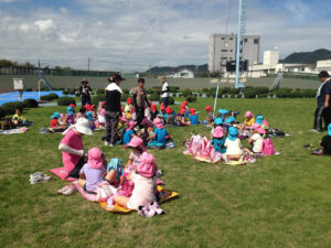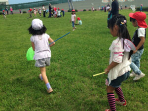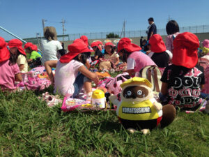 地元の幼稚園からたくさんの園児達が集合。バンクの芝生にたくさんいるバッタ取りにやってきましたc(*゚ー^)ノ