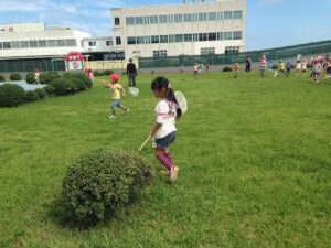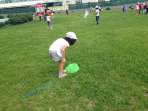 いよいよバッタ取り開始!!走る子ども達にびっくりして、芝生のあちこちからバッタが飛び出す!!