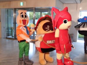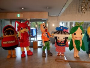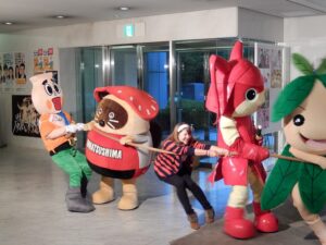 番組は夕方5時からの生放送(ドキドキ)緊張しながら打合せをしていましたが、徳島県から出場のたくさんのゆるキャラに囲まれて、緊張もほぐれましたC=(^◇^