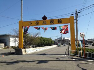 競輪場正門入り口付近。大漁旗が掲げられています(^^)