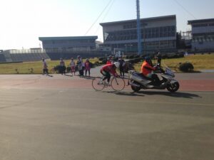 バンクではバイク追走練習を見学。バイクの後ろを走ることで、空気抵抗がなくなりさらにスピードアップ!!!!