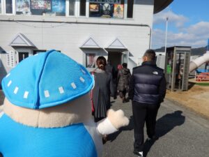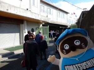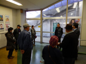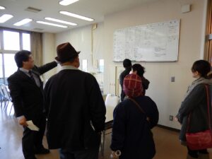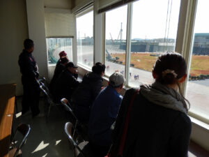 選手宿舎入り口で説明。ここから、選手食堂・・・宿舎(宿泊部屋)・・・休憩室などをぐるっと回ります。