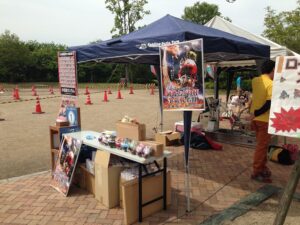 朝から準備。立派なテントとコースが出来ました。もちろん、キックバイクレースに参加してくれた方、また1着になった方にはポンスターグッズをプレゼントいたします(*>ω<)ノ