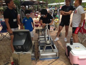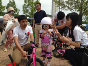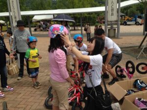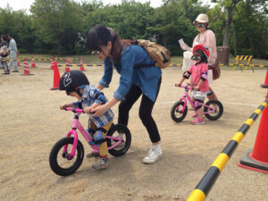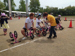 さて、お客さまのお出迎えも終わって、競輪ブースではキックバイク競争の始まり(^^)
