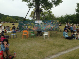 特設ステージの会場に設けられた黒板。みんな好きなことをかいています。