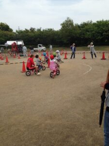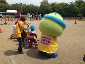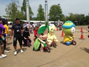 まめっちゃ、あーるえーちゃんもキックバイクに参戦!!これには選手も黙っていない!!選手といっしょに競争です(^^)
