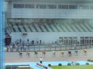 この眺めのいい場所は、サイクルシアター2階観覧席。今開催中は、初心者ガイダンスと選手会ブースとして解放してました。