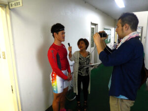 検車場でインタビューを受けているところをパチリカメラぴかぴか(新しい)