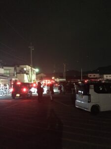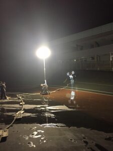お客様が帰ったあと、スタッフは夜中の清掃活動です。明日の競走に支障が出ない様、花火の燃えかすやホコリなどを洗い流していますε=( ̄。 ̄;)フゥ