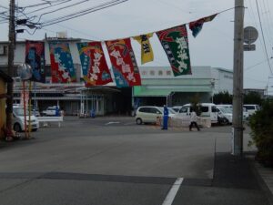 競輪場入場口には大漁旗が飾られてます。こちらは西門側。
